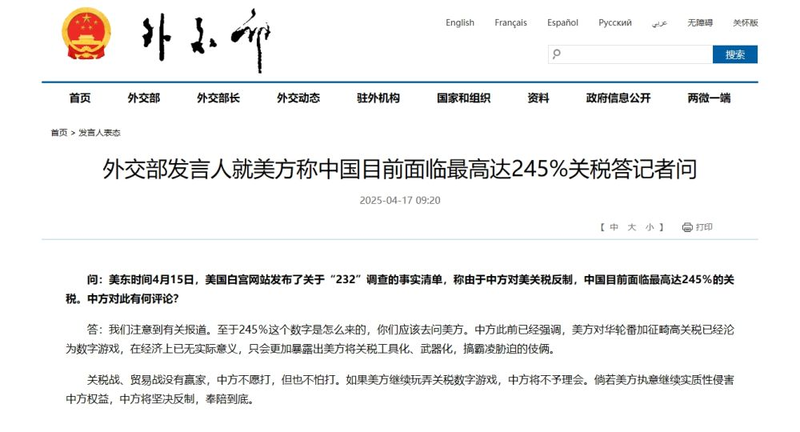 外交部发言人就美方称中国目前面临最高达245%关税答记者问
