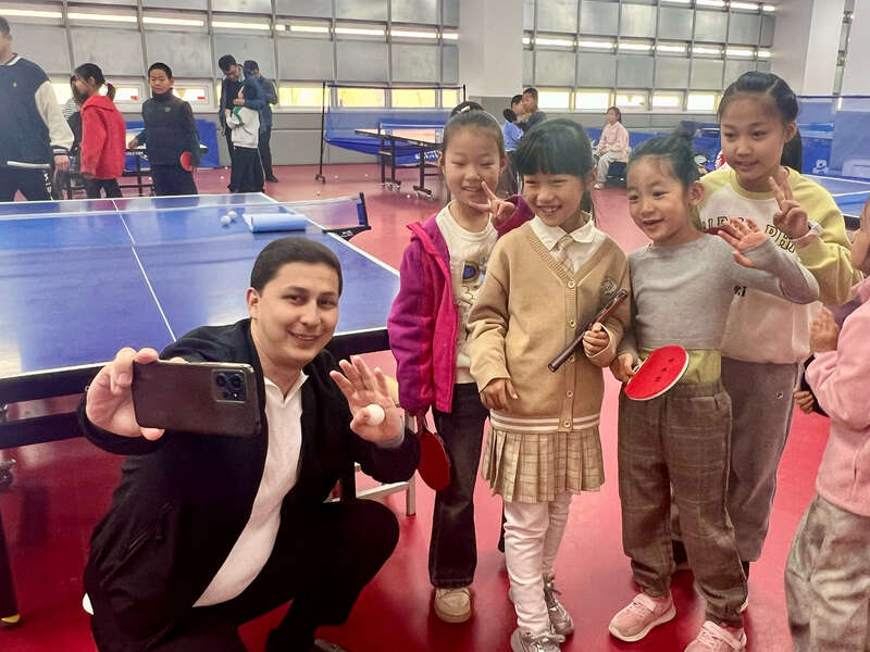 4月13日,宁夏银川,2025“未来之桥”中国-中亚青年领导人研修交流营期间,中亚青年代表在宁夏青少年活动中心与中国小朋友切磋乒乓球后合影留念。中青报·中青网记者 赵安琪/摄