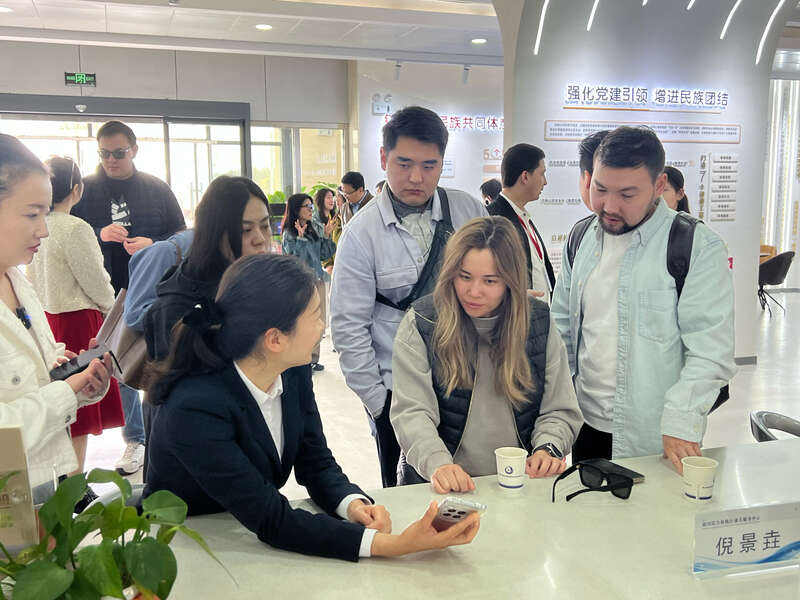4月15日,宁夏银川,2025“未来之桥”中国-中亚青年领导人研修交流营期间,中亚青年代表在银川综保区服务中心了解宁夏与中亚国家外贸发展情况。中青报·中青网记者 赵安琪/摄