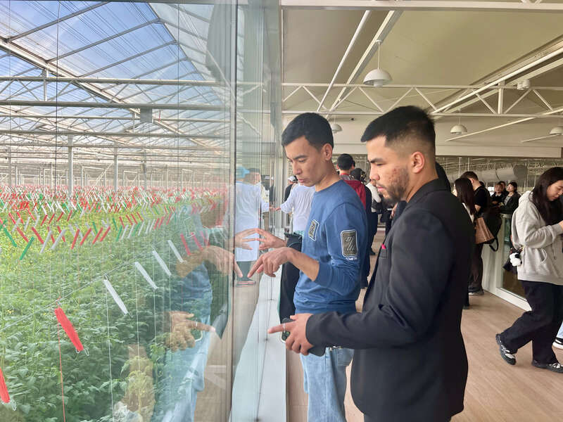 4月13日,宁夏银川,2025“未来之桥”中国-中亚青年领导人研修交流营期间,中亚青年代表在凯盛浩丰(银川)智慧农业产业园观察智慧玻璃温室内无土栽培的樱桃番茄,了解数字技术如何赋能农业发展。中青报·中青网记者 赵安琪/摄