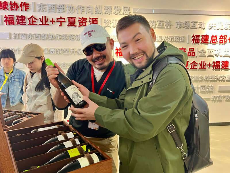 4月13日,宁夏银川,2025“未来之桥”中国-中亚青年领导人研修交流营期间,中亚青年代表在闽宁新貌展示中心了解闽宁镇的红酒,深入感受从“干沙滩”到“金沙滩”的发展奇迹,见证中国乡村振兴的生动实践。中青报·中青网记者 赵安琪/摄