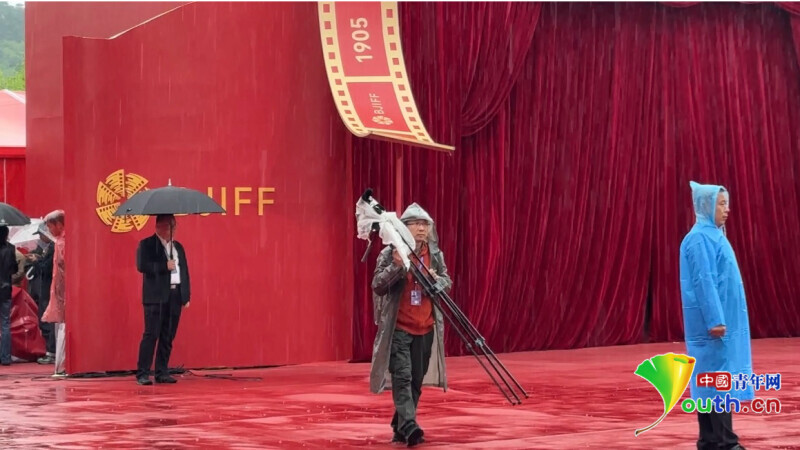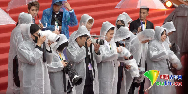 红毯区,摄影师冒雨拍摄。中国青年网记者 纪佳琦摄