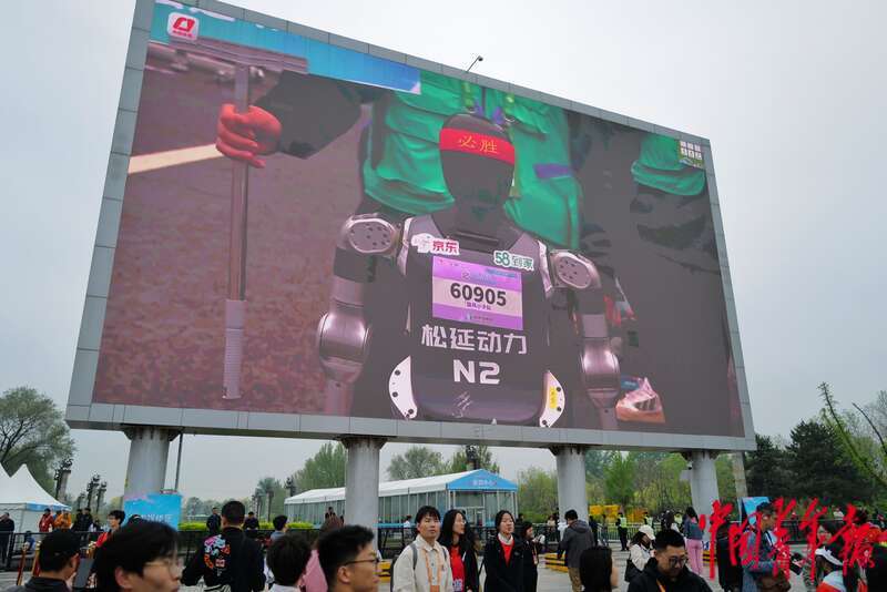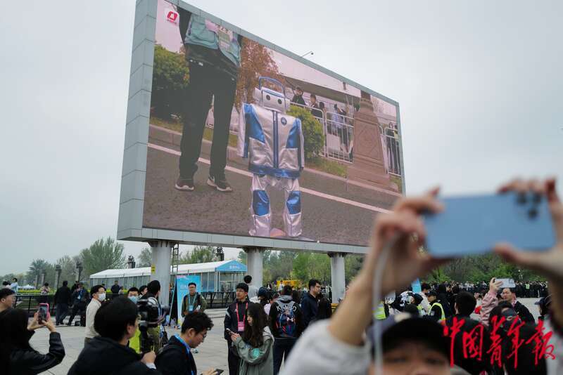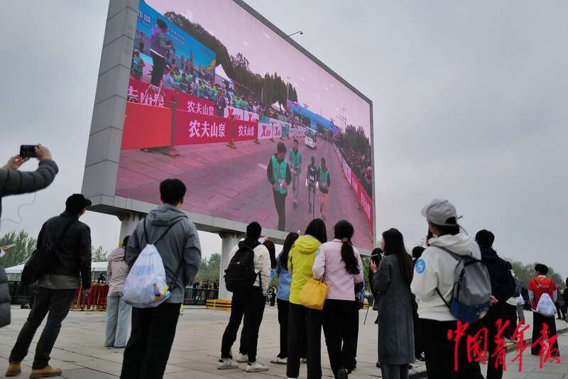 4月19日7时30分,北京亦庄半程马拉松暨人形机器人半程马拉松在南海子公园南门开跑,市民观众在大屏幕上关注开赛情况。中青报·中青网记者 赵迪/摄