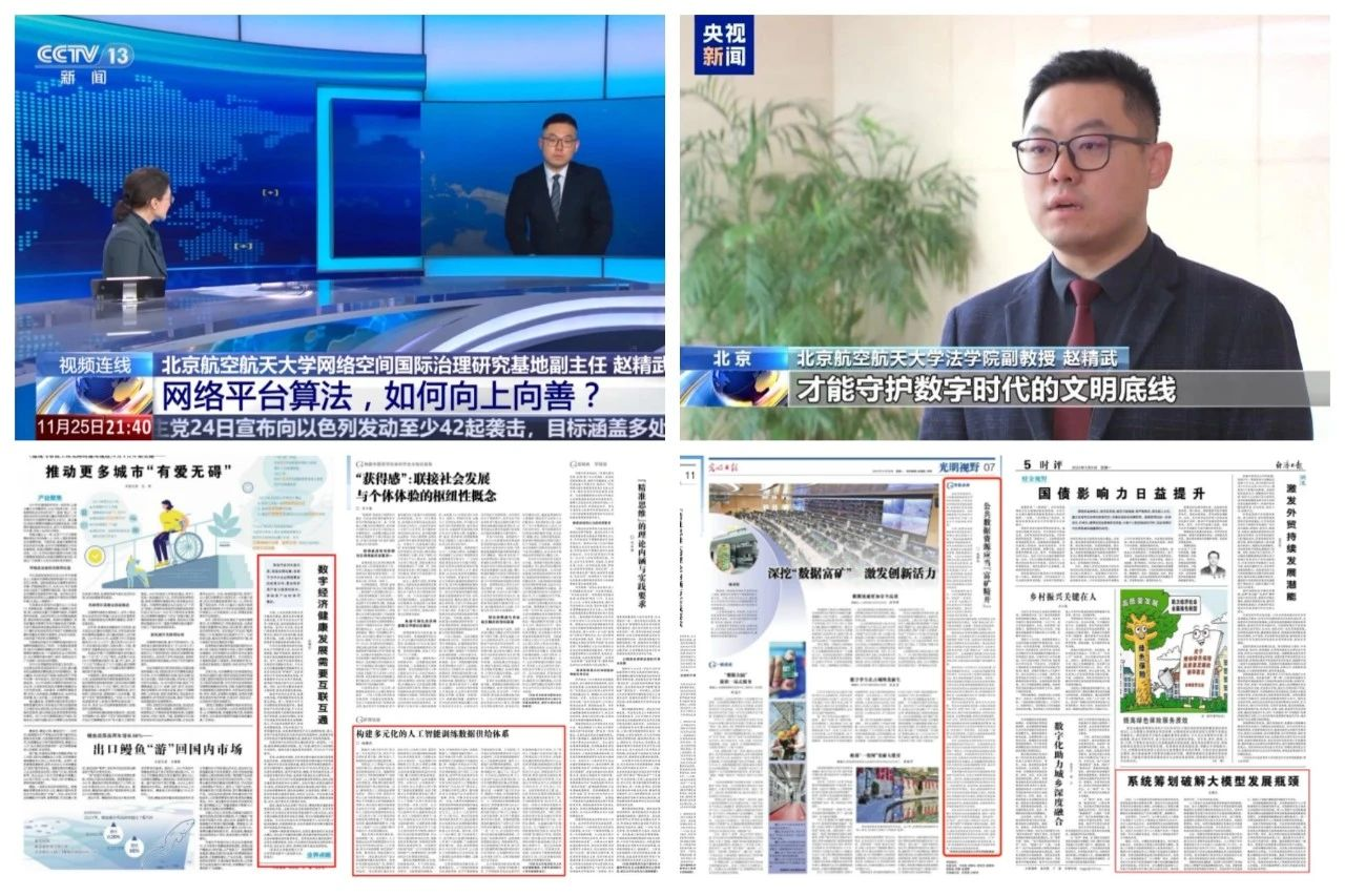 对于信息茧房与大数据杀熟等网络平台算法问题、博流量的网络直播乱象、网络水军背后黑灰产业链治理、高危害性网络暴力规制难题等社会热点,赵精武 多次接受媒体采访,强调应加强源头治理、精准监管和多方联动机制建设,形成社会共治的格局。针对公共安全视频图像信息系统的管理、AI“复活”逝者等技术的应用边界,他援引相关法律法规指明合法性界限,强调个人隐私保护与人工智能技术规范应用。部分内容获中央电视台以及《人民日报》《光明日报》《经济日报》《中国社会科学报》《法治日报》等媒体广泛报道,有效推动 学术研究成果向社会治理效能转化。