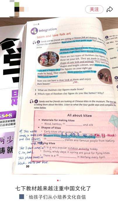 近日,有多位网友晒出新版中小学英语教材课文,展示其中新增的北京四合院、风筝、端午节等中国传统文化内容,并感叹“给孩子们从小培养文化自信!”