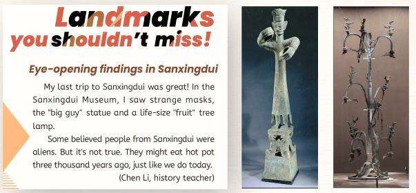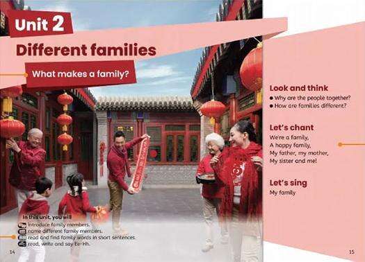 网友晒出的篇目并非个例。在新版英语教材中,处处可见“中国风”:单元开篇页以喜气洋洋贴春联、挂灯笼的插画来解释“family”(家庭)概念;教家庭成员单词的小板块,爷爷奶奶穿着唐装,给一岁的小妹妹举行抓周仪式;阅读语篇中,用儿童化语言去介绍古蜀文明的青铜立人像、神树等考古发现……