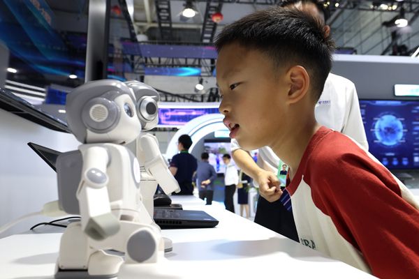 2025年4月28日,福州,小朋友在第八届数字中国建设峰会体验区与智能机器人互动。当日,第八届数字中国建设峰会现场体验区在福州海峡国际会展中心正式开放,人工智能和数据元素突出。据了解,2025年的现场体验区首次设立低空经济专区,集中展示30多项“数据要素+低空经济”的创新技术和应用;现场推出超过100个体验互动项目,汇集百余台智能机器人产品。