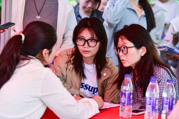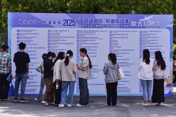 2025年4月29日,安徽阜阳,求职学生在校园招聘会上查看招聘信息。 春绽芳华·职通未来—— 2025年“工会送岗位 乐业在江淮”安徽阜阳市工会、阜阳幼儿师范高等专科学校联合招聘会举行,共有近百家用人单位提供3000余个岗位,吸引众多应届毕业生前来应聘。