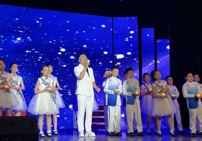 4月30日,贵州贵阳,2025贵州希望工程升级版·“壮苗计划”——“茅台王子·致敬奋斗”省级示范活动暨启动仪式上,希望学子、青年歌手陆林溪与“壮苗计划”学子代表演唱歌曲《又见星河》。 中青报·中青网见习记者 蒋继璇/摄