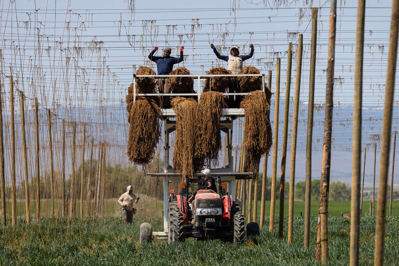 5月2日,美国华盛顿州,农场工人在啤酒花田中安装挂绳。视觉中国供图