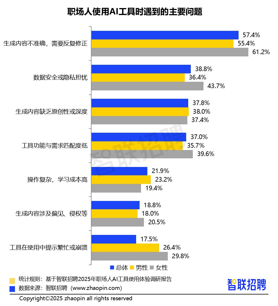 报告称,调研数据显示,57.4%的职场人认为AI生成的内容不够准确,需要反复修正;另有38.8%的职场人对数据安全及隐私存在担忧,市面上还没有哪款AI工具能保证万无一失,一旦商业机密泄露,那损失简直不敢想。还有超三成的职场人遇上生成内容缺乏原创性和深度、功能匹配不上需求的糟心情况。