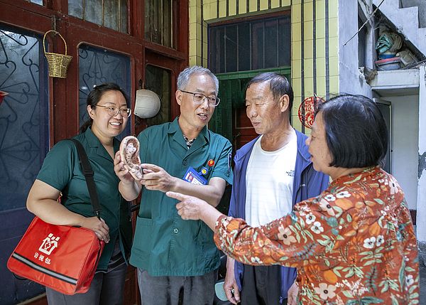 2025年5月19日,河南省焦作市博爱县鸿昌街道九街社区,清化镇卫生院家庭签约医生为居民普及中医穴位艾灸知识。