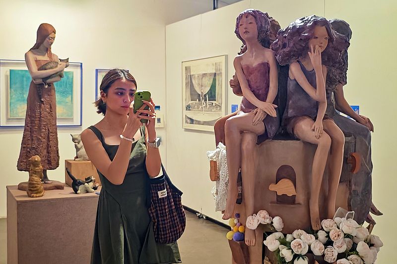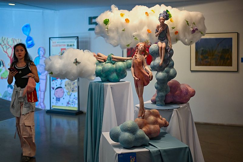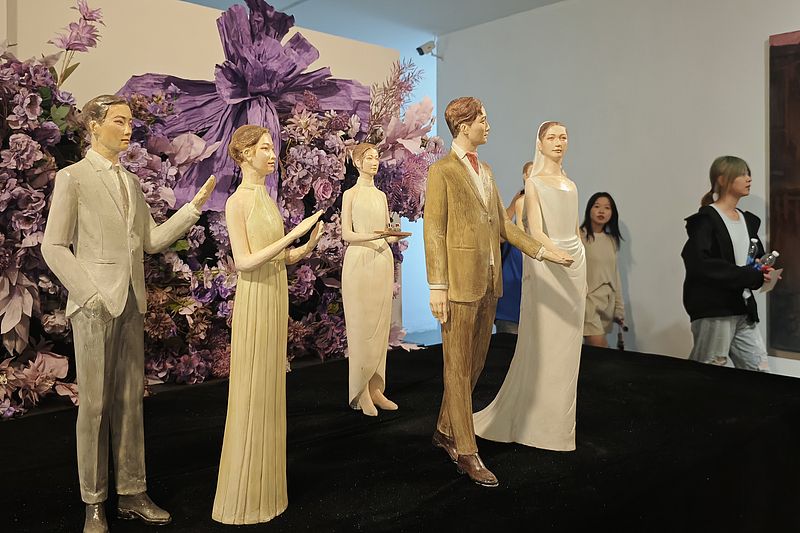 2025年5月20日,南京艺术学院“520毕业展演嘉年华”美术·设计·传媒毕业作品联展在南艺美术馆举办。 观众在展厅内欣赏展出的毕业作品。
