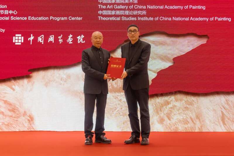 王克举将展览中的数件作品无偿捐赠,刘万鸣为王克举(左)颁发捐赠证书。