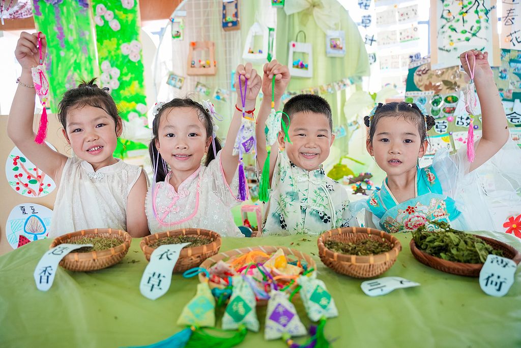 “端午”制作香囊、香包是我国传统民俗,佩戴用艾草、香草等中草药填充的香囊有助于安神辟邪、预防蚊虫叮咬。端午临近,浙江省湖州市长兴县林城中心幼儿园的小朋友们在老师讲解指导下体验制作香包,感受传统民俗的魅力。