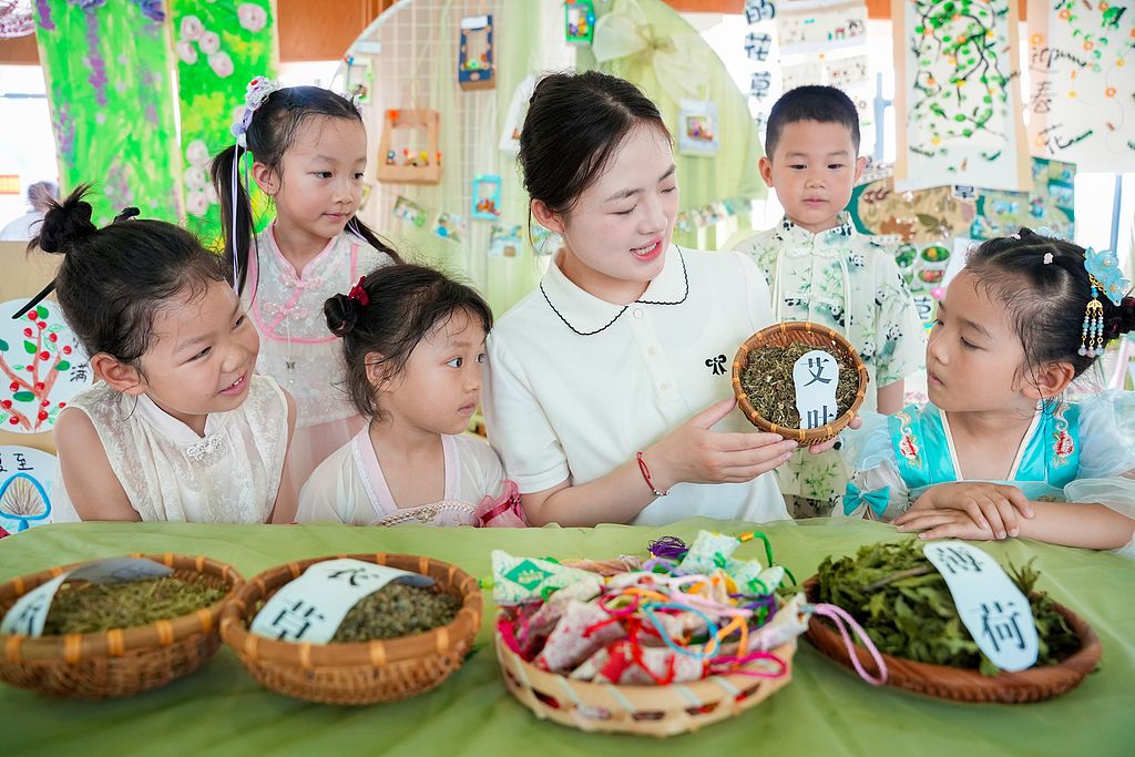 2025年5月22日,浙江省湖州市长兴县林城中心幼儿园开展巧手做香包、浓情过端午活动,老师向小朋友们介绍传统手工香包制作及相关科普知识。