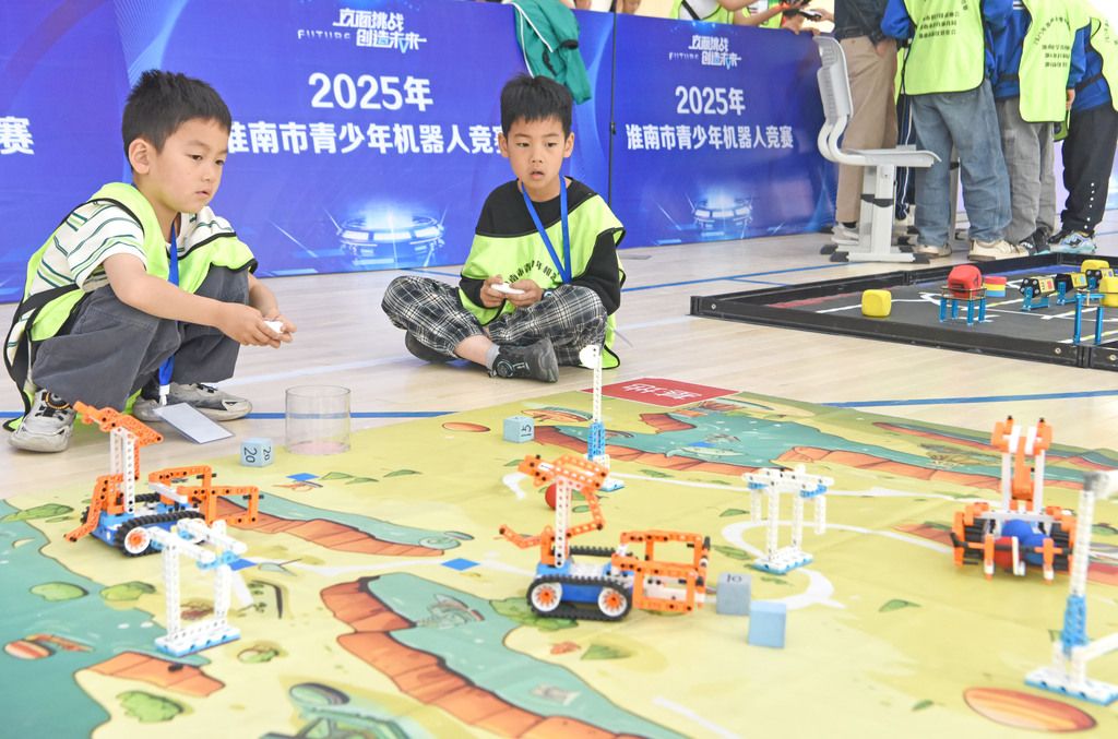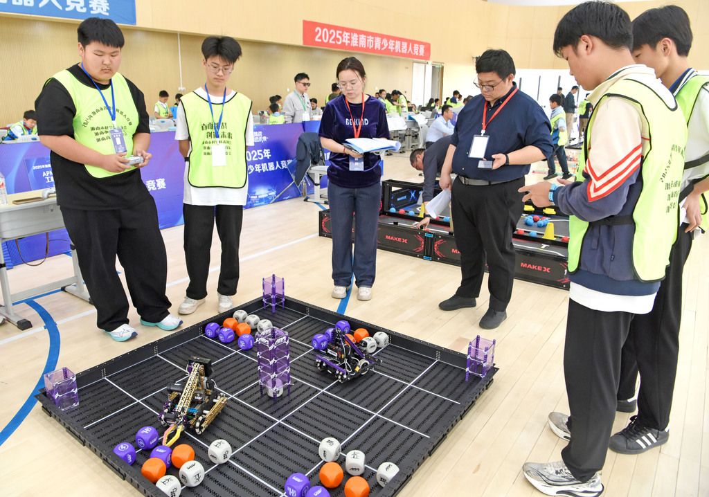2025年5月24日,安徽淮南,参赛选手在青少年机器人竞赛中比拼。