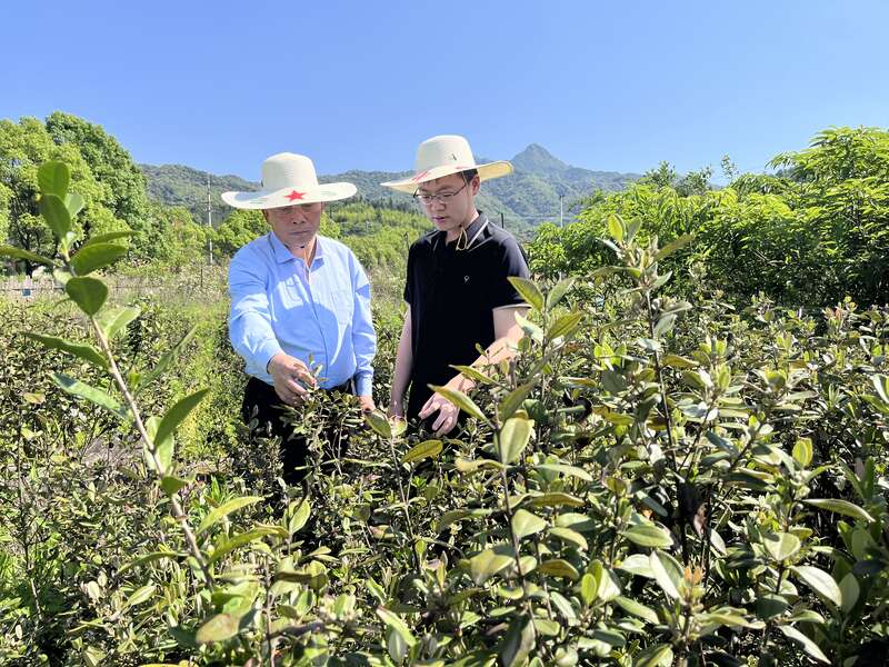 华锦先(左)与罗越(右)察看培斜村中草药园。