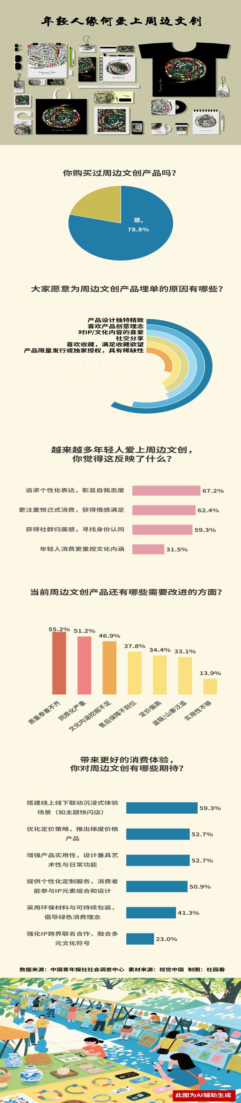 近年来,文创产业蓬勃发展,越来越多的周边文创产品不仅成为连接传统与现代、实用与审美的桥梁,更成为年轻人表达个性、进行社交的重要媒介。你购买过周边文创产品吗?提升年轻人的周边文创消费体验,你有哪些期待?上周,中国青年报社社会调查中心展开了一项有关周边文创消费的专题调查,有很多数据发现。