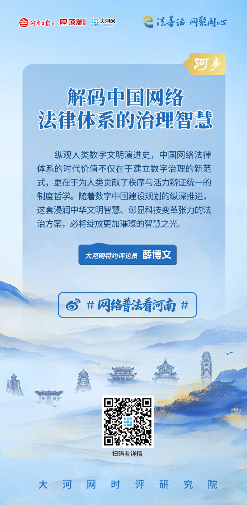 纵观人类数字文明演进史,中国网络法律体系的时代价值不仅在于建立数字治理的新范式,更在于为人类贡献了秩序与活力辩证统一的制度哲学。随着数字中国建设规划的纵深推进,这套浸润中华文明智慧、彰显科技变革张力的法治方案,必将在构建清朗网络空间的全球进程中绽放更加璀璨的智慧之光。(大河网特约评论员 薛博文)