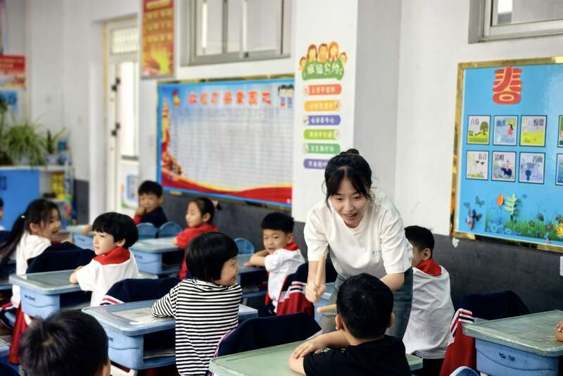 山东兰陵,中央音乐学院音乐教育专业的同学正在给孩子们上音乐课。中央音乐学院供图