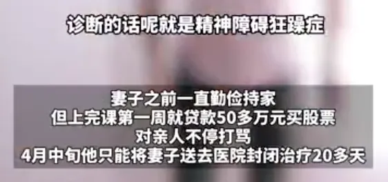 该市民称,妻子上完“进阶课”第一周的课程后就性情大变。妻子原本勤俭持家,但上完课后贷款50多万元买股票。后来她变得愈发狂躁,不管对什么亲人都会不停打骂。4月中旬,他只能将妻子送去医院封闭治疗20多天,医生诊断为“精神障碍狂躁症”。