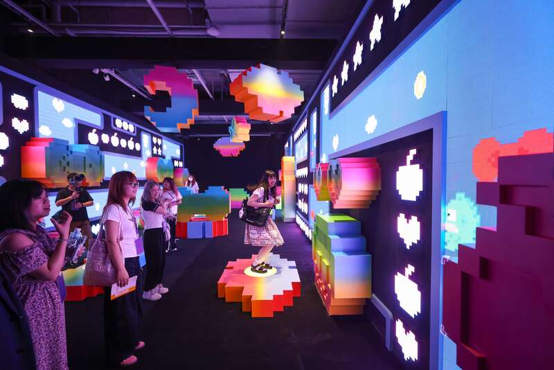 《萌力拥抱》启用灯光互动编程,轻轻一拍,将出现治愈的彩色光芒;当你走进超级大苹果装置内,将看到《缤纷愿景》,用互动科技及镜面穹顶,让每个人书写专属于自己的无界空间;踏入《像素异想》区域,新媒体装置空间以8-bit像素打造数字化乐园,以斑斓积木重构现实与虚幻的边界。