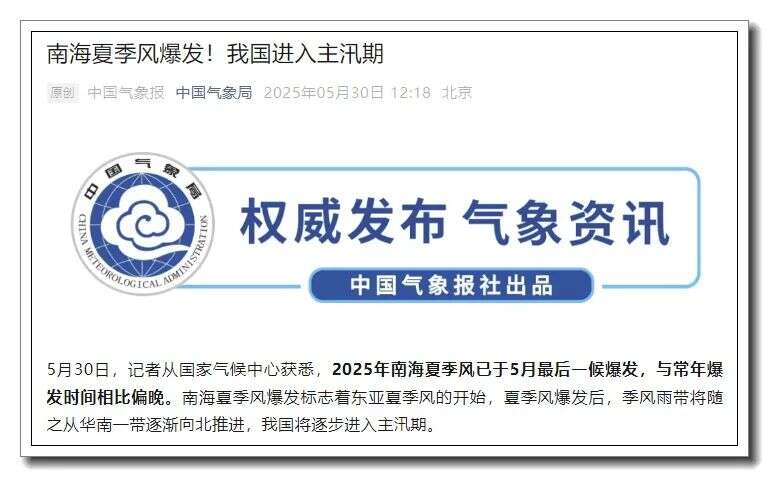 另外,据最新消息,南海夏季风已于5月最后一候爆发,我国将逐步进入主汛期!