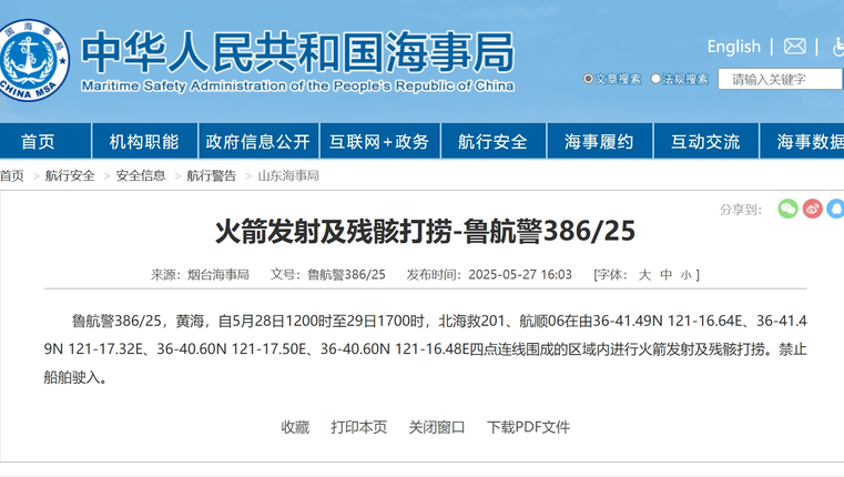 航行警告!黄海部分海域进行火箭发射及残骸打捞