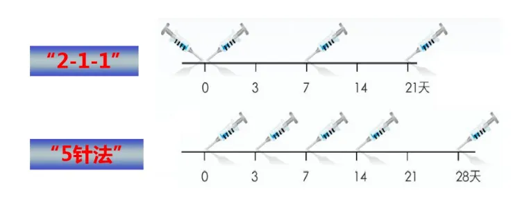 4针法:第0天接种2剂,第7、21天各一剂。