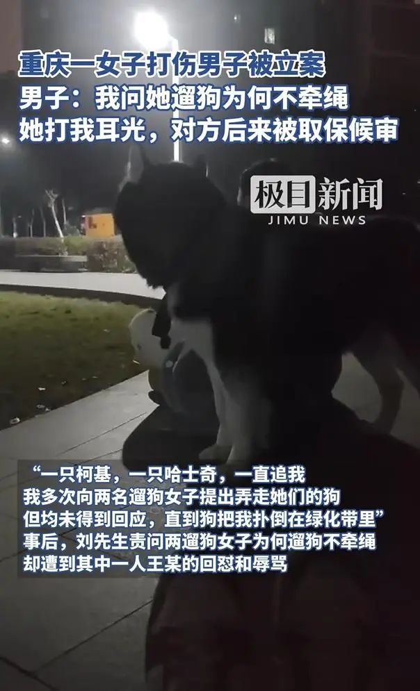 报道显示,当晚刘先生牵着朋友的狗准备出小区,遭到两只没牵绳的狗疯狂追赶,而后被扑倒在绿化带里。事后他责问对方却遭到其中一人回怼,随后双方发生纠纷。“她打了我一耳光”“她又冲过来抢我的手机,并用手机狠狠砸我面部,鲜血直流”,刘先生称。他报警后,警方拟刑事立案,但后来女子取保候审。相关小区物业和街道办事处工作人员均表示,当地有明确规定,遛狗必须拴绳牵绳。