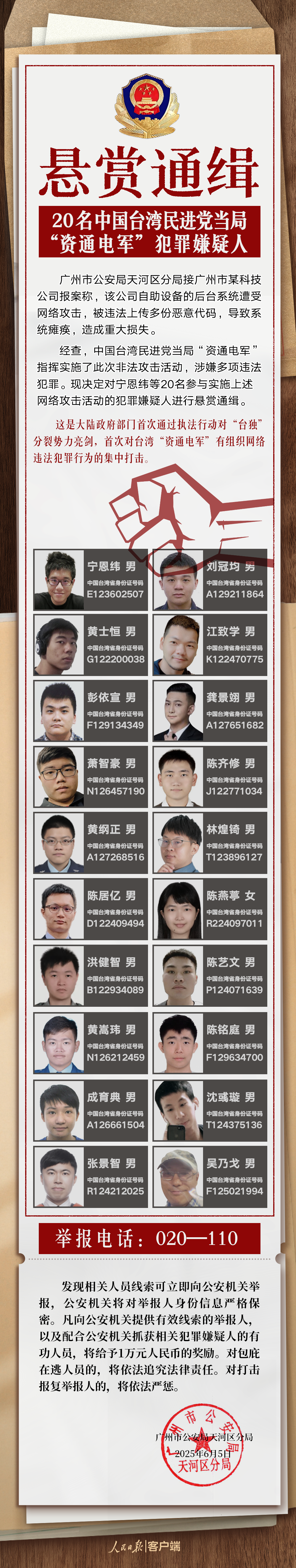 悬赏通缉!20名中国台湾民进党当局“资通电军”犯罪嫌疑人