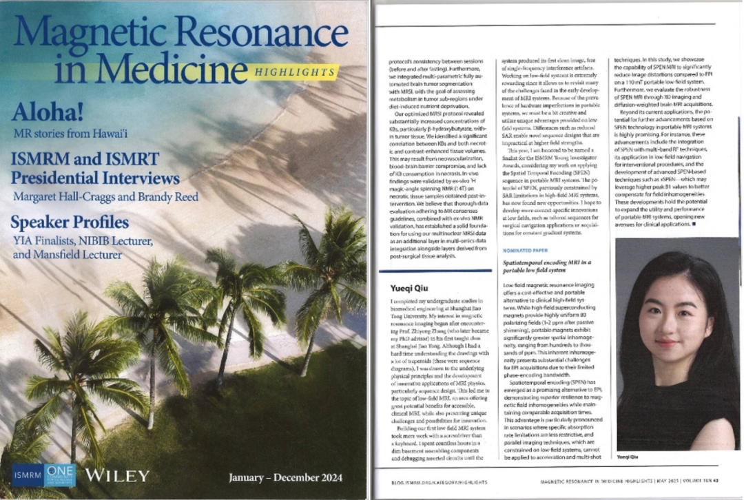邱月淇来自上海交通大学生物医学工程学院张志勇老师课题组,该研究团队从斯坦福大学、伊利诺伊大学厄巴纳-香槟分校(UIUC)、哈佛大学麻省总医院(MGH)等全球顶尖机构中脱颖而出,所获奖项名称为Prince-Meaney Translational Science Award,获奖论文题目为“Spatiotemporal Encoding MRI in a Portable Low Field System”。