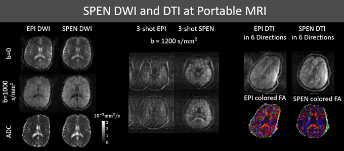 获奖研究创新性地开发了适用于无多通道并行加速便携设备的SPEN(时空编码)采集方法。与传统的EPI(平面回波成像)技术相比,该方法的欠采样图像展现出更小的几何失真。相关成果已发表于磁共振领域权威期刊《Magnetic Resonance in Medicine》。值得关注的是,研究团队在评奖报告中进一步展示了SPEN技术的系列创新拓展,包括SPEN DTI、SPEN RF-encoded及xSPEN等技术在便携式磁共振设备上的转化应用。这些突破不仅推动了低场磁共振技术的发展,更为便携式MRI设备的临床转化应用提供了关键技术支撑。