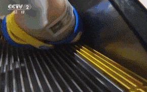 消防员将洞洞鞋放在梯级侧面,随着电梯行进,鞋子被挤压变形,几乎是一瞬间,这双洞洞鞋就被电梯侧边的缝隙吸了进去。