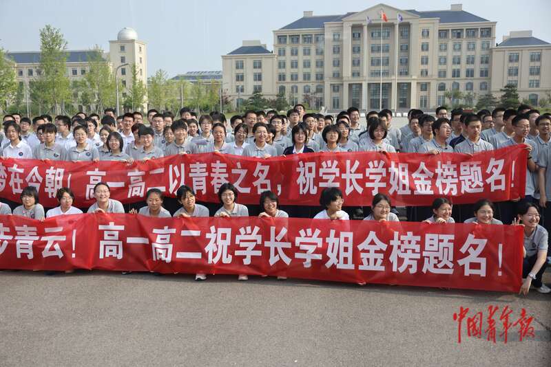 6月7日早上,山东威海,荣成三中,高一高二的学生为高考生拉横幅加油。中青报·中青网记者 曲俊燕/摄