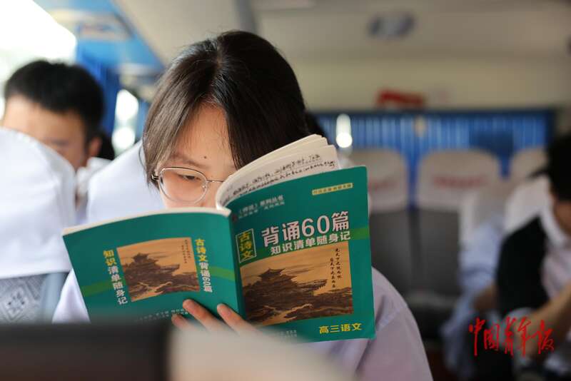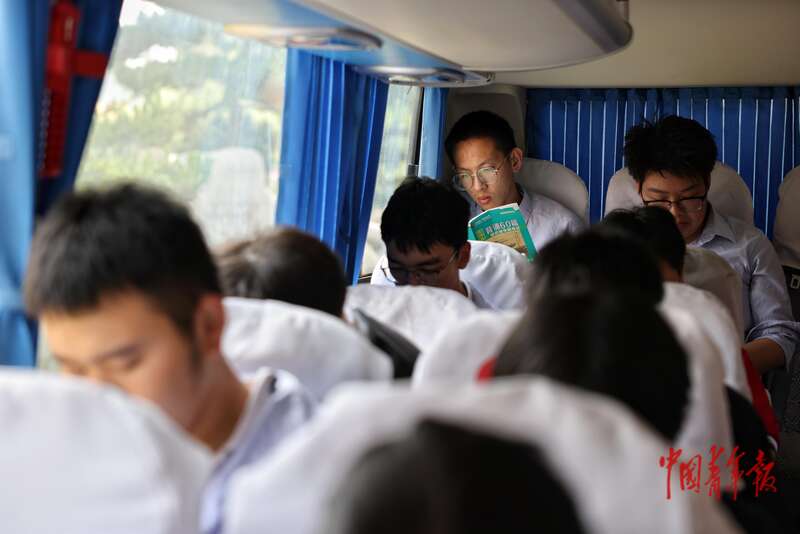 6月7日早上,山东威海,荣成三中,高考生乘坐大巴车去往考点,在车上进行最后的复习。中青报·中青网记者 曲俊燕/摄