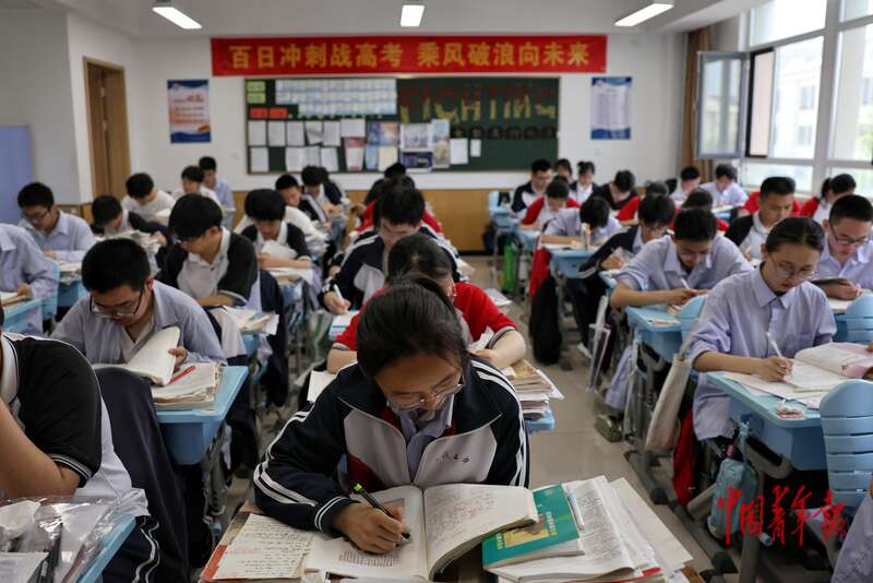 6月7日早上,山东威海,荣成三中,高考生出发前,在教室进行最后的语文早自习。当日是2025年全国高考首日,山东69.2万高考生步入考场。中青报·中青网记者 曲俊燕/摄