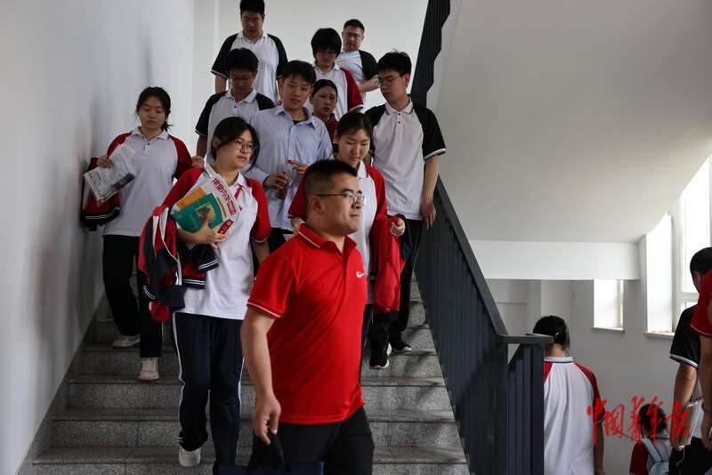 6月7日早上,山东威海,荣成三中,高考生和送考老师下楼出发去考点。中青报·中青网记者 曲俊燕/摄