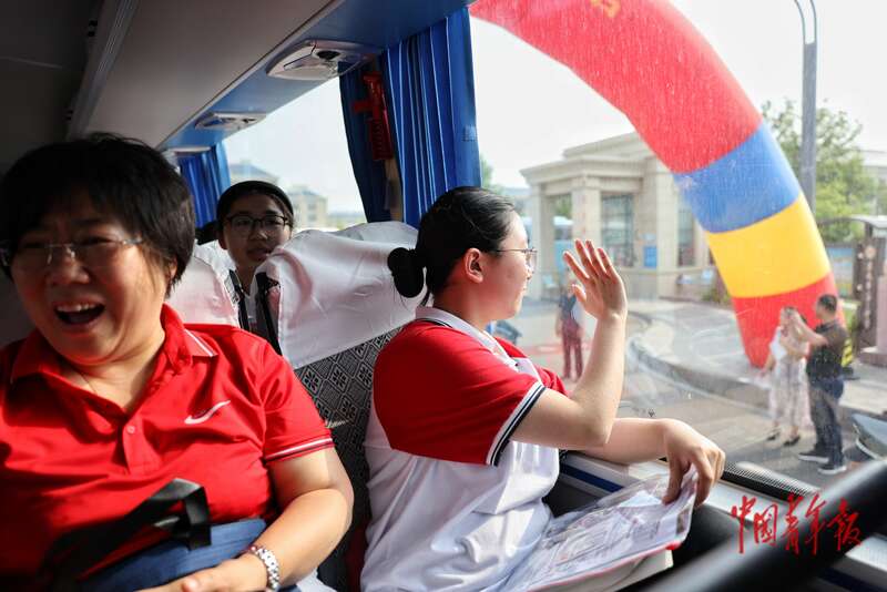 6月7日早上,山东威海,荣成三中,一名高考生向大巴车外的送考人群打招呼。中青报·中青网记者 曲俊燕/摄
