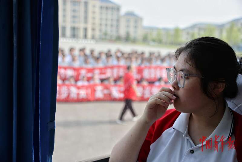 6月7日早上,山东威海,荣成三中,一名高考生在即将前往考点的大巴车上。中青报·中青网记者 曲俊燕/摄