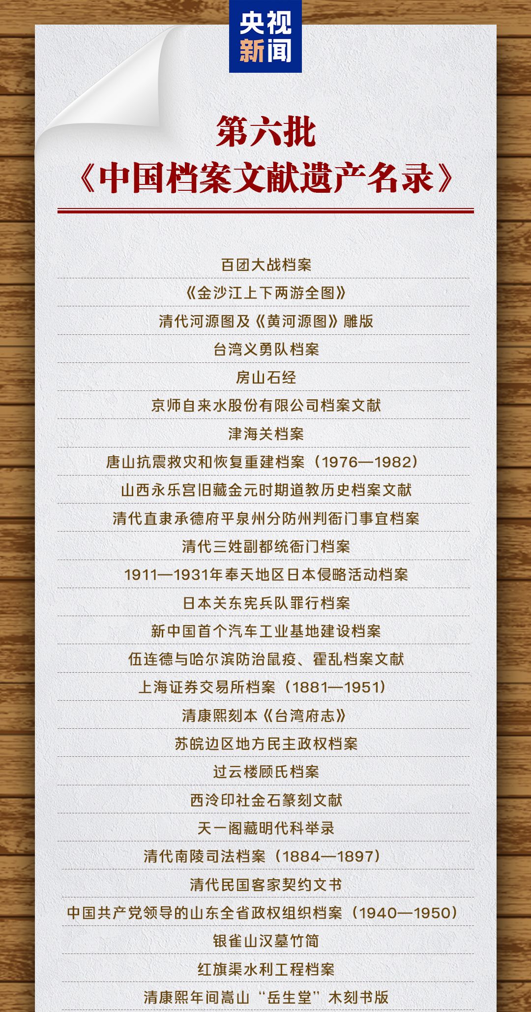 今天(6月9日)是国际档案日。档案,见证着历史,传承着文化。国家档案局公布第六批《中国档案文献遗产名录》,其中包括《百团大战档案》《“重庆大轰炸”档案》《红旗渠水利工程档案》《何尊等五组周代有铭青铜器》《银雀山汉墓竹简》《广交会创办初期档案(1956—1959)》《民族团结誓词碑档案》等52个项目。