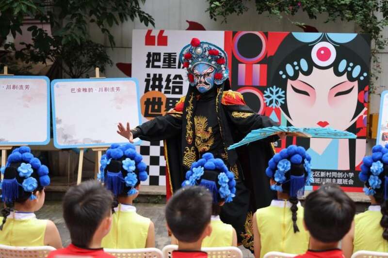 活动伊始,江北区新村同创小学以“非遗 戏曲 传承”为主题开展川剧主题班会。内容涵盖川剧的历史渊源、艺术特点、经典剧目赏析等环节。小演员们化身"生旦净末丑",特别是"刀马旦"的精彩唱段引得留学生们连连鼓掌,纷纷举起手机记录。当川剧演员展示"一秒变脸"绝技时,现场惊呼不断,留学生们直呼"不可思议"。