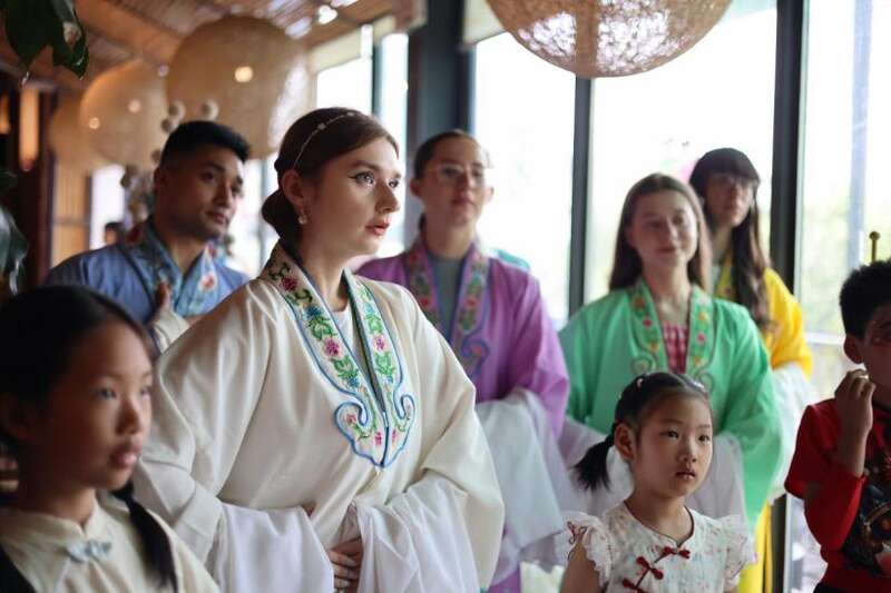 重庆川剧院的演员张严威化身礼仪导师,为身着传统戏服的留学生们开启了一场穿越时空的礼仪课堂。他细致讲解并亲身示范中国古代男女初次见面时的典雅礼仪,留学生们全神贯注,跟随老师的一招一式,模仿古人的温婉行礼与风雅仪态。其间,张严威还巧妙融入川剧唱腔教学,留学生们学得有模有样,婉转的唱腔虽略显青涩,却饱含对传统文化的敬意与热爱。体验结束后,留学生们纷纷化身“古代才子佳人”,在古色古香的场景中打卡留影,将这难忘的文化之旅定格成永恒记忆。
