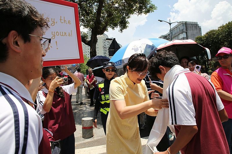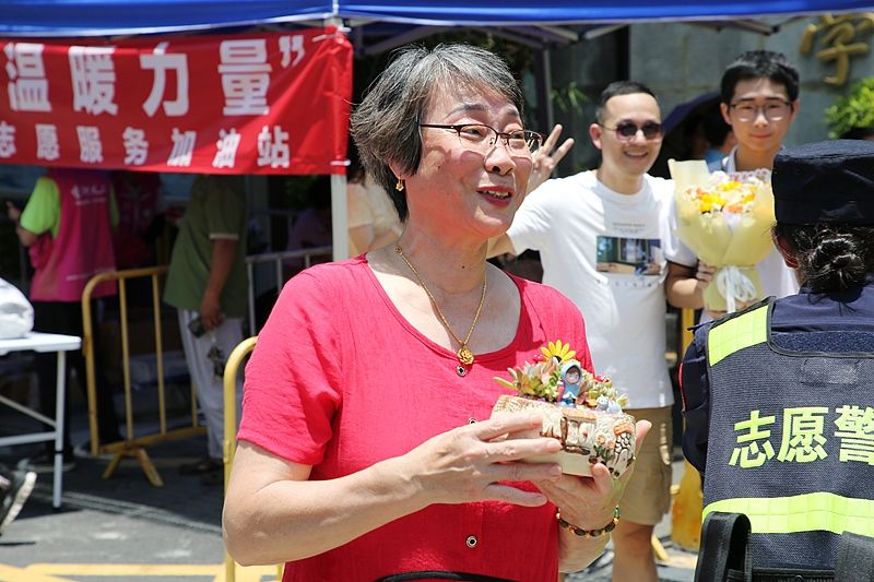 2025年6月9日,广东珠海,高考结束珠海二中考点,考生结束考试,走出考场,考生家长和亲友鲜花相迎。珠海四中西藏班的老师,向结束考试的考生献哈达,表示祝福。