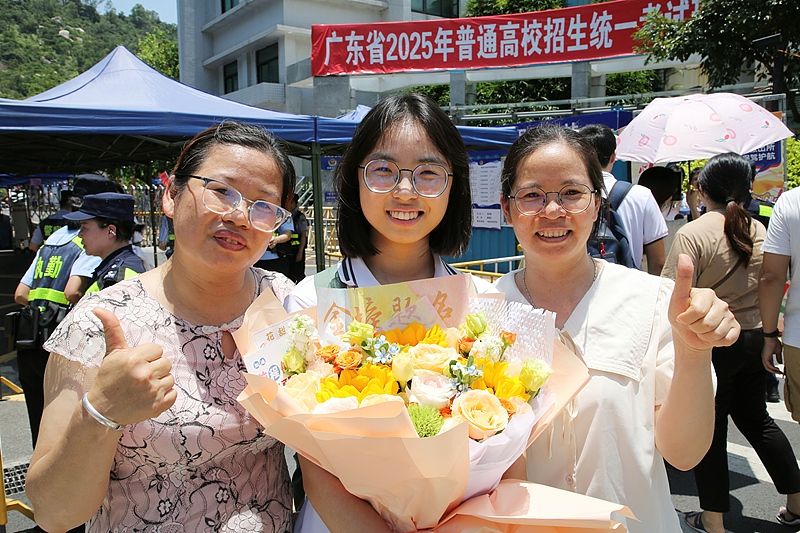 2025年6月9日,广东珠海,高考结束珠海二中考点,考生结束考试,走出考场,考生家长和亲友鲜花相迎。