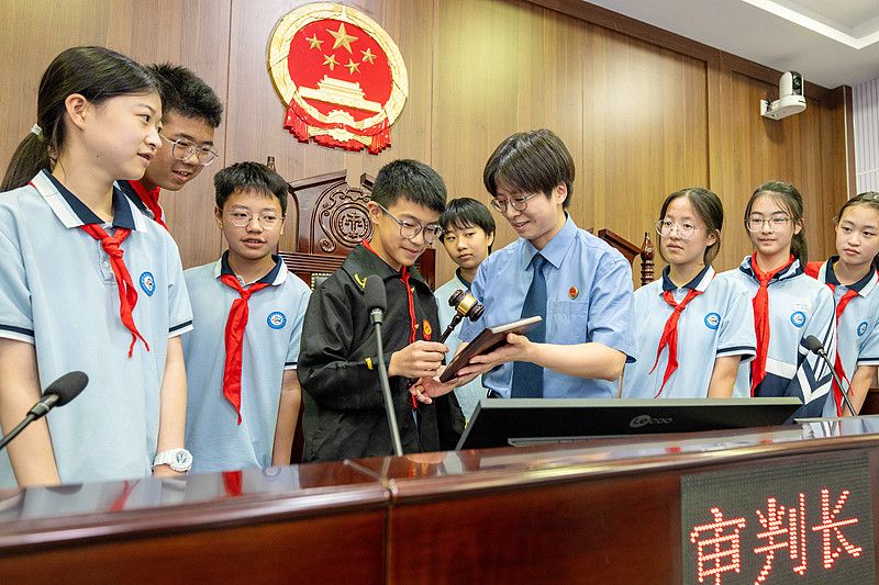 2025年6月9日,浙江湖州长兴县人民法院城北法庭,合溪实验学校学生体验使用法槌。