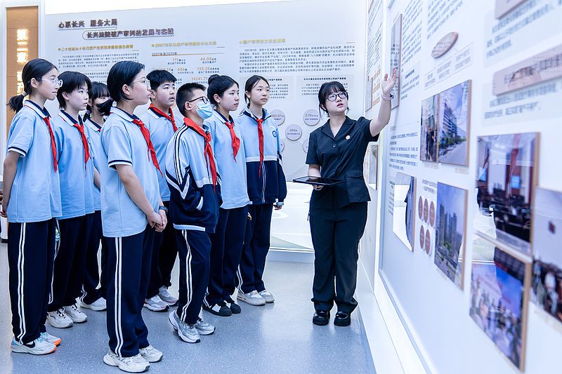 2025年6月9日,浙江湖州长兴县人民法院城北法庭,长兴县合溪实验学校学生参观法治长廊。