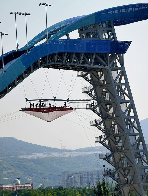 2025年6月8日,北京石景山,首钢园滑雪大跳台上新设置的“心跳咖啡”空中平台,市民在此品咖啡浏览周边美景。