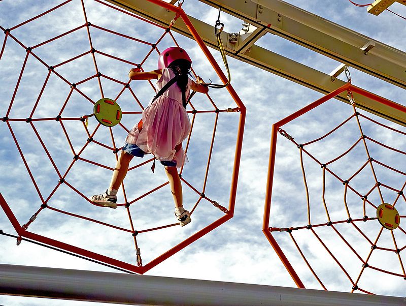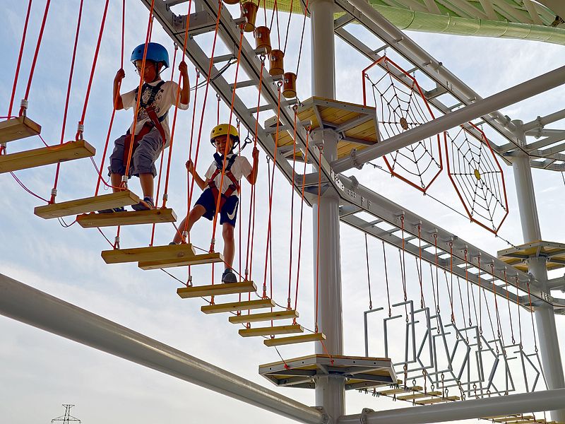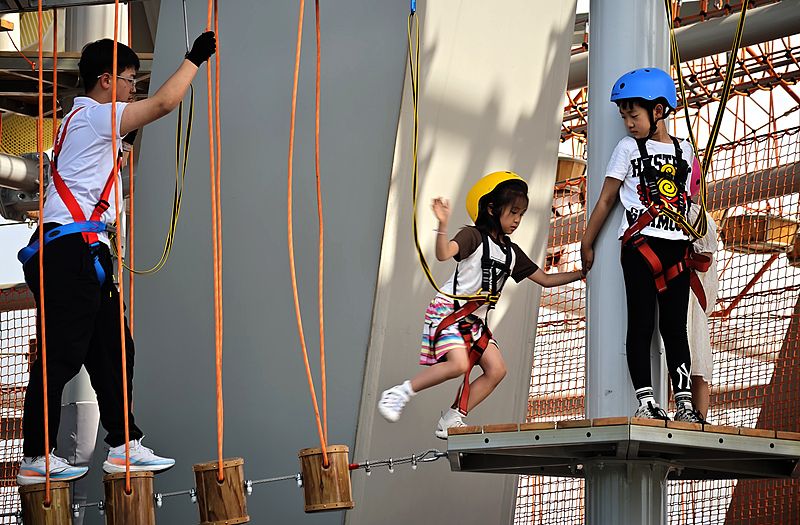 2025年6月7日,北京石景山,首钢园滑雪大跳台下方设置的“跳台斜坡攀网”吸引孩子们体验挑战自我。